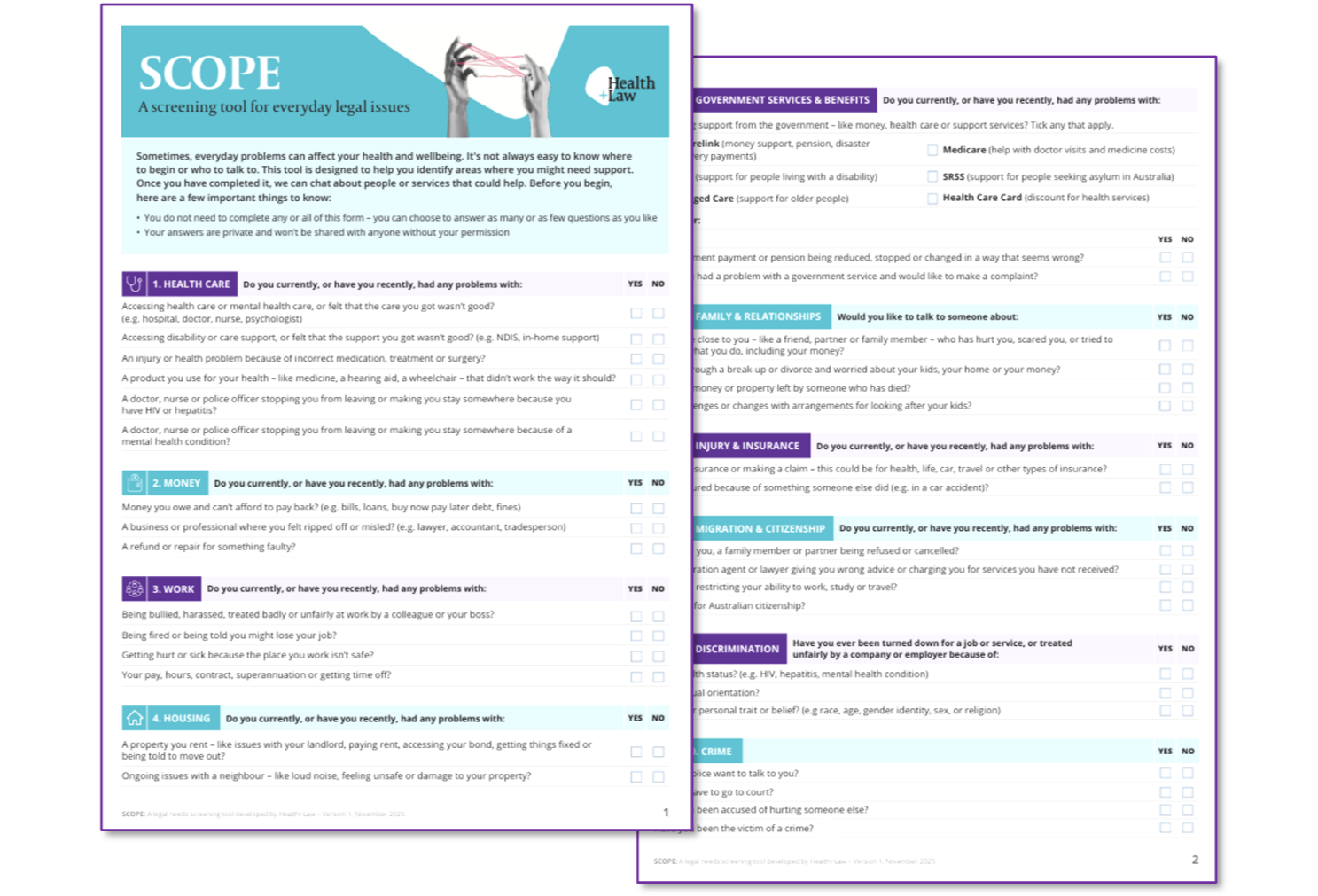 Alongside the e-Learning module, Health+Law has developed SCOPE – a screening tool for everyday legal issues.