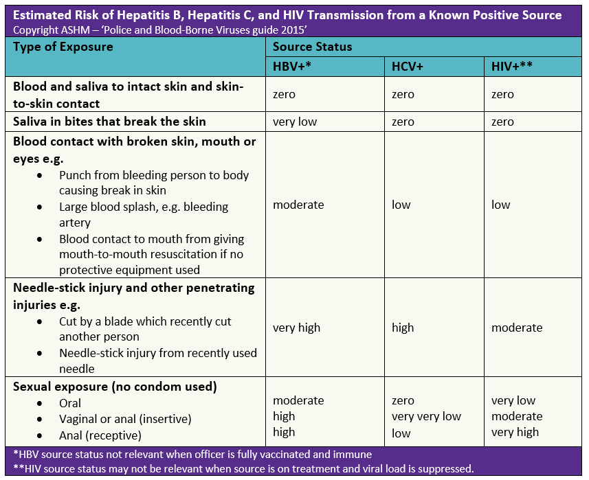 The brief supplements this summary with a useful table from ASHM’s 2015 ‘Police and Blood-Borne Viruses’ guide (reproduced below) which sets out the risk of transmission in various circumstances for these viruses.